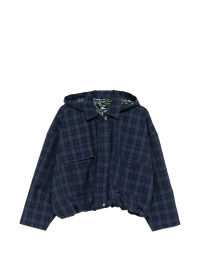 navy blue check pattern collared front button fastening drawstring hem front flap pockets