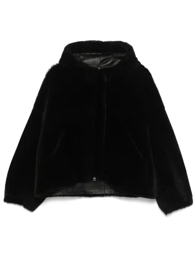 black shearling front two-way zip fastening classic hood drop shoulder long sleeves two side welt pockets leather lining drawstring hem