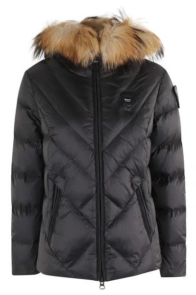 Alicia down jacket - Blauer - Black color - Quilted waterproof fabric - Hood with removable fur trim - Logo on left sleeve with rhinestones - Side zippered pockets - Short model - Front zipper closure.