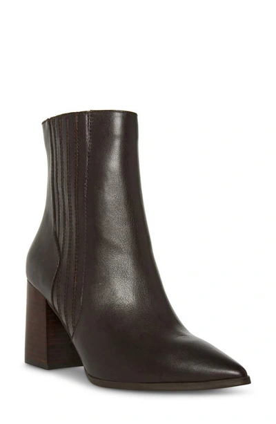 A stacked block heel lends modern elevation to this sleek pointy-toe bootie rendered in smooth leather and finished with a side zip and stretchy inset panel.