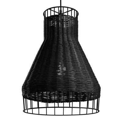 Colored rattan is intertwined with a steel framework to create a pleasing hand woven pattern of peekaboo light. Mounts to ceiling.