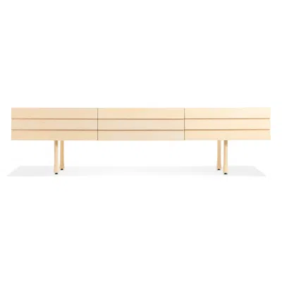 Overlapping wood drawer and door fronts give the collection its name, while the white washed maple finish and a scene stealing leg bring the visual charisma. With soft close doors and drawers. Three leg finish options available.