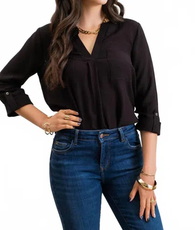 BLU PEPPER Split Neck Back Button Three Quarter Tab Sleeve Top In Black