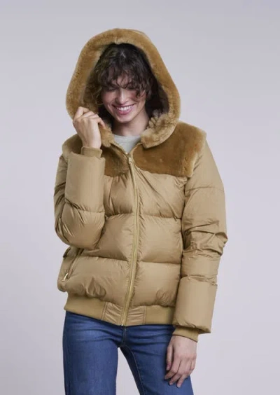 Down hooded jacket with shearling yoke Super warm down jacket, zipper closing, shearling lined hood.