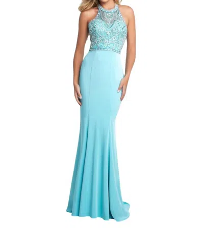 Just add a cute little clutch and a matching heel for the perfect event look.Introducing the Beaded Bodice Gown With Cascading Ruffled Back by Blush Prom, a stunning choice for any prom night. This sleeveless sheath gown in Tiffany features a multi-colored beaded bodice accentuated by a cascading ruffle detail on the skirt. Material - Crepe. Closure - Zip closure. Adorned with a sweep train and halter neckline, this dress promises a memorable entrance.