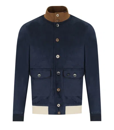 Bob jacket made of blue reindeer-effect fabric. Pockets with front flap, removable logo pin, button closure. High collar, ribbed stretch fabric cuffs and hem. Slim fit. This item has a small fit, we recommend purchasing one size larger than usual. Composition: 57% polyester, 43% cotton, 4% elastane.