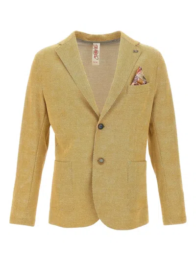 golden yellow two-button fastening notch lapels front pockets pocket square detail
