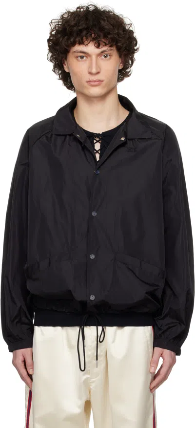 Bode's black nylon track jacket draws inspiration from a 1980s Boy Scouts windbreaker, embodying a classic yet modern aesthetic. The design features a drawstring hem for an adjustable and tailored fit, complemented by enamel horseshoe-and-star snap buttons and a subtle Bode monogram. This piece appeals to those who appreciate a blend of retro charm and practical functionality. - 100% Polyamide
