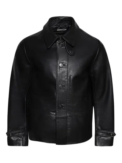 BODE presents a premium black leather jacket made from 100% cow leather. The classic button-up front and pointed collar create a sophisticated yet minimalist look. With a polished finish and subtle seam detailing, this jacket combines style and function. The slightly boxy silhouette features practical side pockets, making it suitable for both casual and upscale occasions.- 100% cow leather - Classic button-up front - Pointed collar - Polished finish - Subtle seam detailing - Adjustable buttoned cuffs - Slightly boxy silhouette - Practical side pockets