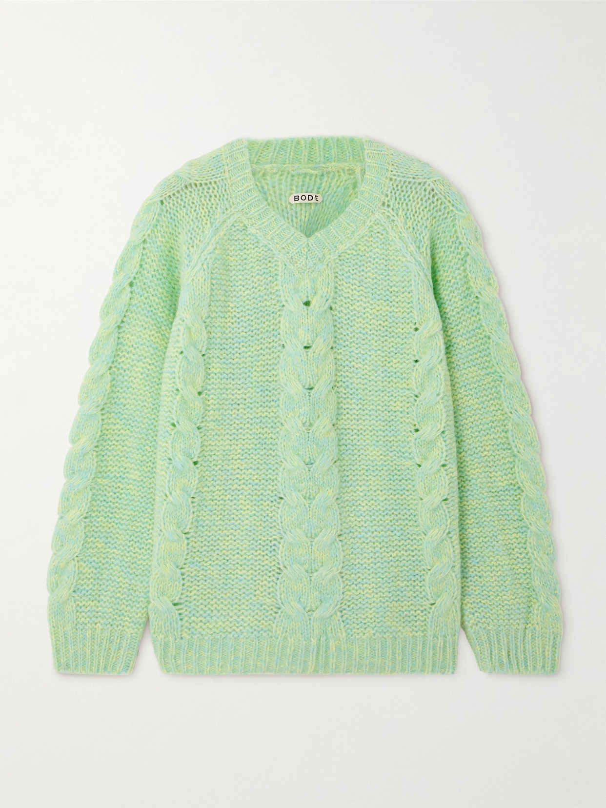 BODE Eiderdown Sweater in Mint 54% baby alpaca 22% super kid mohair 24% mulberry silk. Dry clean. Fuzzy knit fabric. BOFE-WK54. WRF25KT001. About the designer: