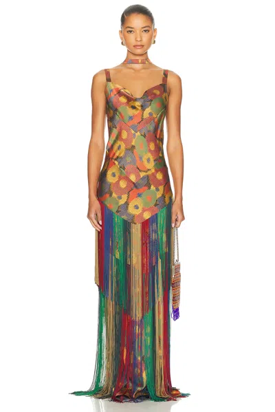 BODE Fruit Pit Dress in Blue 100% silk. Dry clean only. Unlined. Draped fringe at skirt. Detachable silk fringe tie. BOFE-WD39. WRF25DR007. About the designer:
