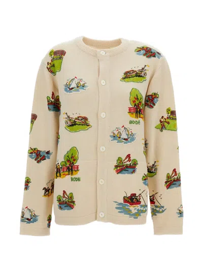 beige patterned jacquard pattern front button fastening crew neck long sleeves ribbed cuffs and hem