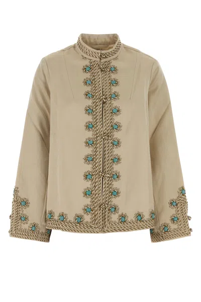 Giubbino realizzato in raso di pura seta arricchito da inserti intrecciati e pietre a contrasto sulle profilature.- Colletto- Chiusura mediante bottoni- Tasche in cucitura - Polsini con bottoni - Foderato Size: S, M