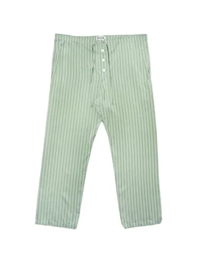 green vertical stripe pattern drawstring waist front button fastening two side slit pockets rear patch pocket straight leg