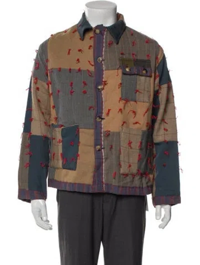 BODE Wool Denim Jacket Blue Printed Distressed & Whipstitch Accents Point Collar Patch Pockets Fit: Outerwear by BODE typically fit true to size. | BODE Wool Printed Denim Jacket in Blue, Men's S
