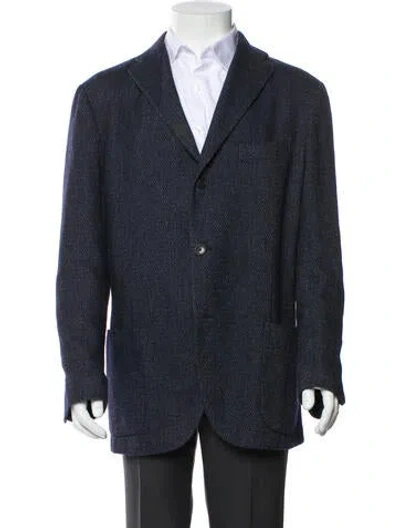 Men's navy blue and black patterned Boglioli blazer with notched lapels, dual vents in back, and three button closure at front. | Boglioli wool patterned blazer in Blue, Men's US46, IT56 | XXL
