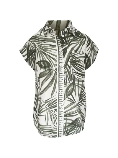 green/beige leaf print chest pocket button fastening short sleeves rounded hem