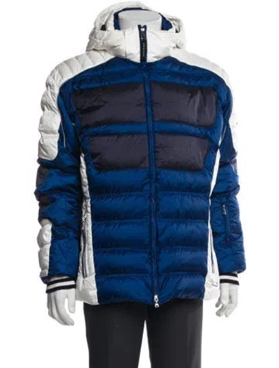 Bogner Puffer Coat Blue Striped With Hood Woven Lining Collar Zip Pockets Fit: Outerwear by Bogner typically fit true to size. | Bogner Striped Puffer Coat in Blue, Men's US34, IT44 | XS