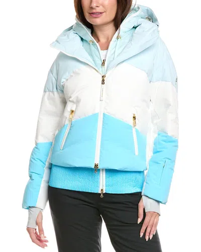 Elevate your winter wardrobe with the Bogner Vila 1 Down Jacket in Light Blue Combo. This luxurious outerwear piece features a removable bib with hood, double hood, two zippered front pockets, a zippered pocket at the left sleeve, and extended cuffs and hem for added warmth. The jacket measures approximately 25 inches from shoulder to hem and is designed for a stylish fit. Made with a shell of 88% nylon and 12% elastane, and a combo of 100% polyurethane, this jacket also has a lining of 100% polyester and fill of 70% duck down and 30% feathers for ultimate comfort. The zipper closure adds a contemporary touch to this classic silhouette. Perfect for the winter season, this jacket is a must-have for any fashion-forward woman. Made by the luxury ski and outerwear brand, Bogner, this jacket is sure to keep you warm and chic all season long.