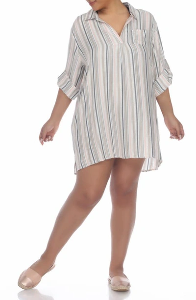 Patterned with timeless stripes, this lightweight shirtdress is detailed with cuffed sleeves and a Johnny collar for effortless style any day of the week. 34" length (size 1X) Johnny collar Three-quarter sleeves Chest pocket Allover print 100% rayon Hand wash, line dry Imported Model stats: 5'10" height, 41" bust, 36" waist, 48" hip. Model is wearing size 1X.