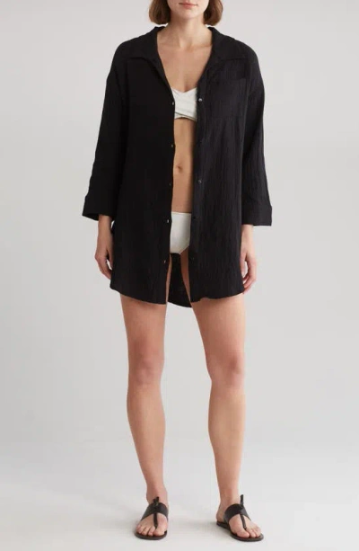 BOHO ME Three Quarter Sleeve Cotton Gauze Button-up Shirt In Black
