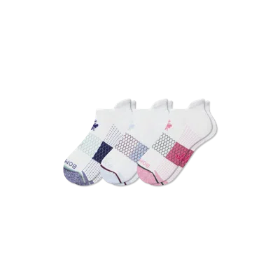 Midweight purpose-built socks with strategic zone cushioning for all-day comfort on the links. Thermoregulation helps your feet breathe, and moisture-wicking keeps sweat away from your body. Made with a proprietary cotton-poly yarn blend that performs but feels natural. There's also a mesh under-toe ventilation zone, an area where feet tend to overheat the most. Women's Golf Ankle Sock 3-Pack - Cloud Pink Mix - Small - Cotton Blend - Bombas
