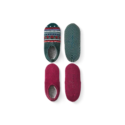 Now made with a thicker footbed for extra cushioning, these Gripper Slippers have an ultra-warm brushed lining and special grips on the outside designed to help prevent slips. You may never want to wear real shoes again. While our grippers are pretty good at helping prevent slips, they’re not magic. So be careful, and practice good coordination out there. Women's Gripper Slipper 2-Pack - Teal Pine Fair Isle X Burgundy - Large - Nylon/elastane - Bombas