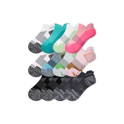 Lightweight, purpose-built socks for running, working out and movement. Bombas Hex Tec construction for breathability and moisture-wicking. Proprietary poly/cotton blend yarns. With comfort innovations like strategic zone cushioning and airflow ventilation. Specially designed to help you move with grace and speed. One purchased = one donated. Women's Running Ankle Sock 12-Pack - Pink Mint Multi - Medium - Bombas