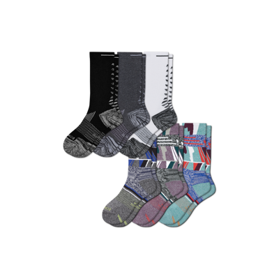 Why did we make our running socks in a calf height? Because they're the perfect rise that never slips or moves around, while even keeping dirt out of your socks while trail running. Bombas Hex Tec construction for breathability and moisture-wicking. Proprietary poly/cotton blend yarns. Made with comfort innovations like strategic zone cushioning and airflow ventilation. One purchased = one donated. | Men's Running Calf Sock 6-Pack - Charcoal Surf Mix - Athletic
