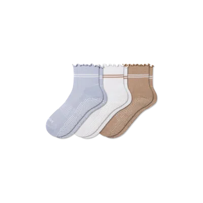 A studio pair with some extra frills. These are designed with our sweat-wicking Softec Yarn, a comfortable mid-foot compression, and bottom grips to help you maintain traction and focus. Note: Our grippers are designed to help improve traction, but they can’t stop every slip. Stay aware and move with care. Women's Studio Gripper Quarter Sock 3-Pack - White Maple Mix - Small - Cotton Blend - Bombas