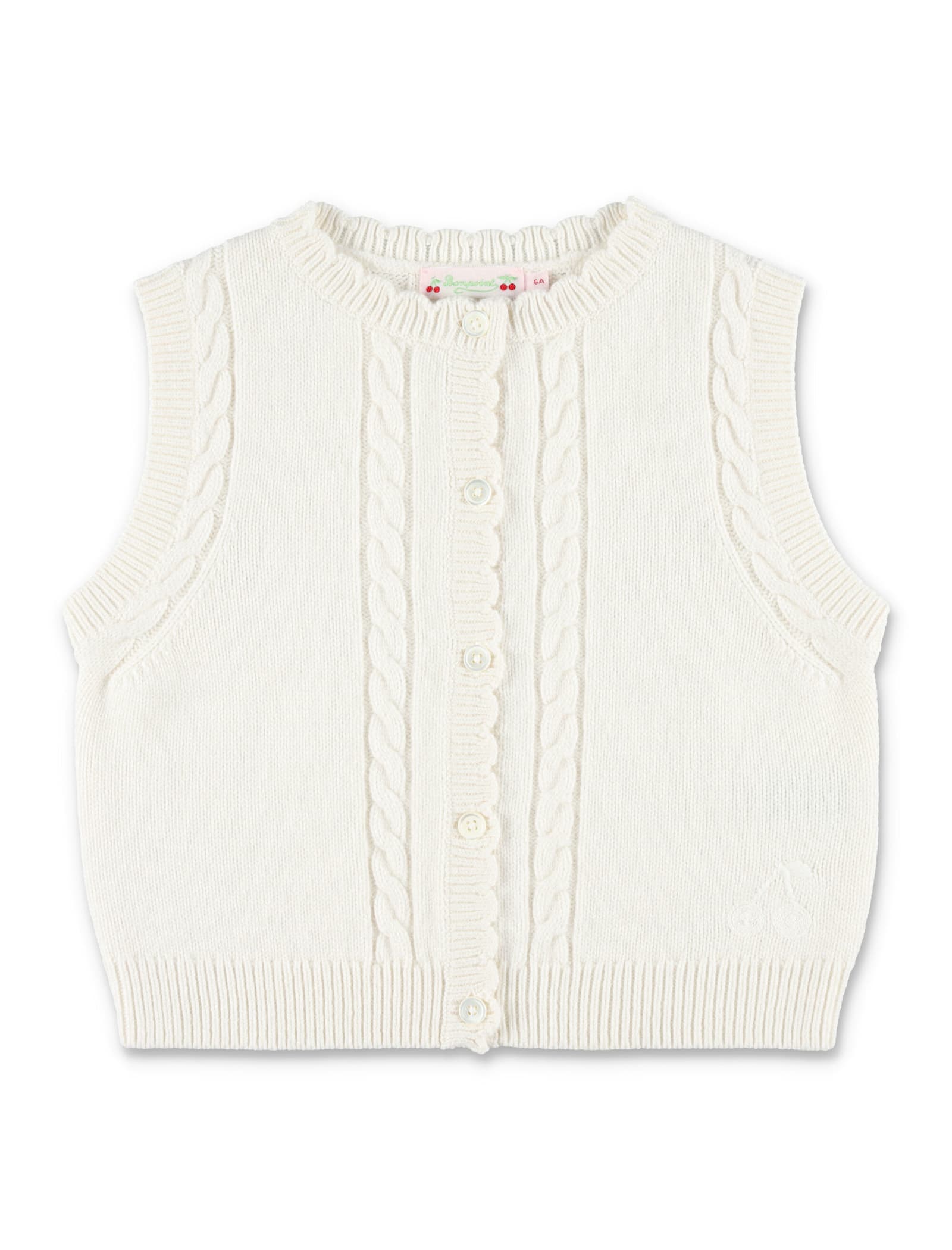 The Jobolène Sleeveless Cardigan By Bonpoint Is A Charming Layering Piece That Combines Warmth And Elegance. Crafted From Soft Wool Sourced From Certified Suppliers Guaranteeing Animal Welfare, It Features Delicate Cable Knit Motifs And Refined Scalloped Trims. The Tone-on-tone Embroidered Cherry On The Hem Adds A Subtle Signature Detail, While The Rounded Neckline And Button Fastening Complete Its Timeless Design. Cable Knit Pattern Scalloped Finishes Rounded Neckline Sleeveless Front Button Closure Embroidered Tone-on-tone Cherry At Hem Composition: 33% viscose, 23% recycled polyamide, 20% cotton, 20% wool, 4% cashmere