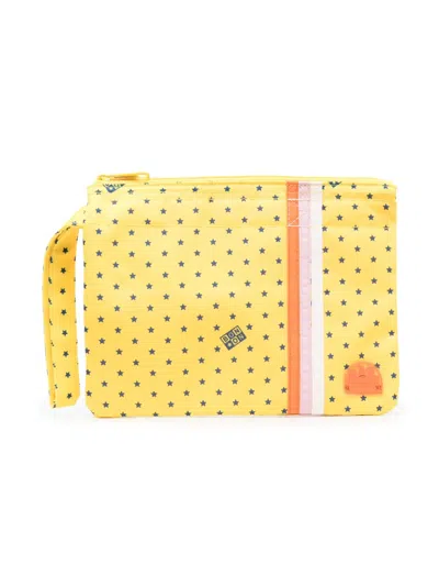 logo-patch bag from Bonton featuring butter yellow, multicolour, logo patch to the front, polka dot print, top zip fastening, wrist strap and main compartment.