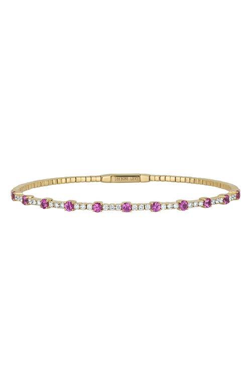 Part of our online trunk show, this style is available for a limited time From July 12 through August 3. Semiprecious stones alternate with diamonds to catch light along the circumference of a bangle handcrafted from 18-karat gold. Total diamond weight: 0.64–0.66ct. Color: G Clarity: VS 18k gold/ruby, sapphire, pink sapphire or emerald/diamond Imported >Diamond Guide