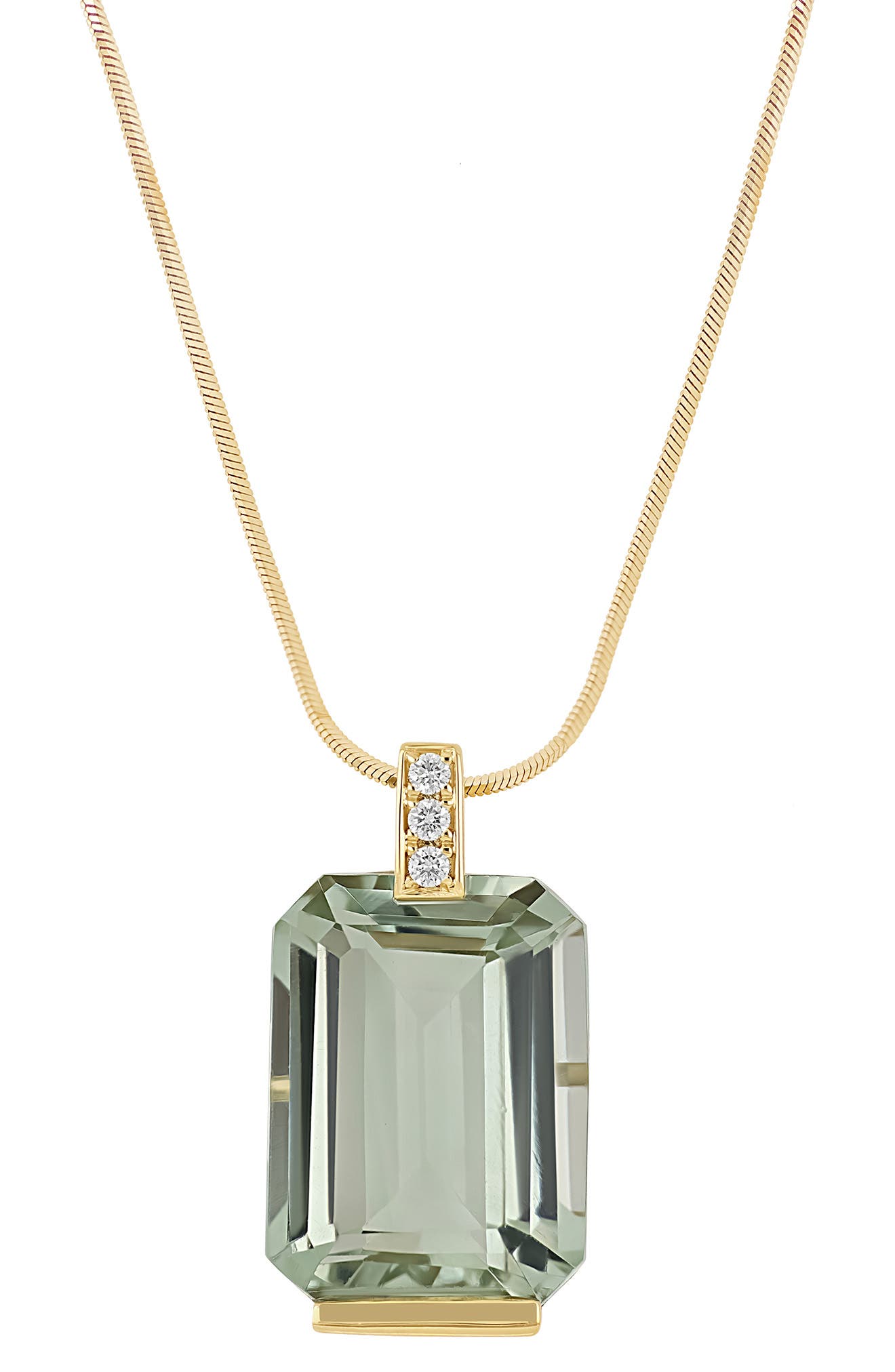 Shimmer both day and night with this handcrafted necklace featuring a polished snake chain, diamond-embellished bail, and sparkling, emerald-cut green-amethyst pendant. 18" length Total amethyst weight: 10.32ct. Total diamond weight: 0.04ct. 18k gold/amethyst/diamond Imported >Diamond Guide
