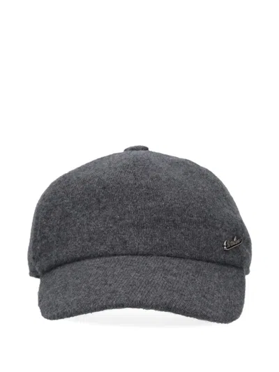 Borsalino Hiker baseball cap in gray cashmere with curved visor, silver metal logo on the side, and adjustable strap at the back. Composition: 100% Cashmere