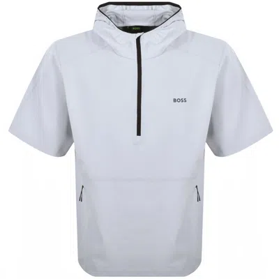 BOSS L CruiseLite Jacket In Pastel Grey. Lightweight jacket with short sleeves constructed from breathable quick dry four way stretch and odor control fabric. A branded quarter zip fastening and a high collar with elasicated hood. Two zip entry pockets at the waist with mesh lining. The BOSS logo is situated on the left of the chest. 100% Polyester.