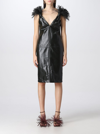 Bottega Veneta demonstrates its expertise in leather with this beautifully crafted minidress in shiny nappa. It has a front vent for ease of movement and is dramatically topped with poufs of leather fringing.