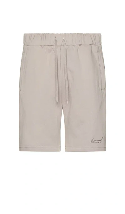 Bound Script Jogger Shorts in Taupe. Size L, M. 82% cotton 18% polyester. Made in China. Machine wash. Elastic drawstring waist. Side slant and singular back slip pocket. Soft jersey fabric. Shorts measure approx 19 in length. BOUR-MF3. Ash Shorts.