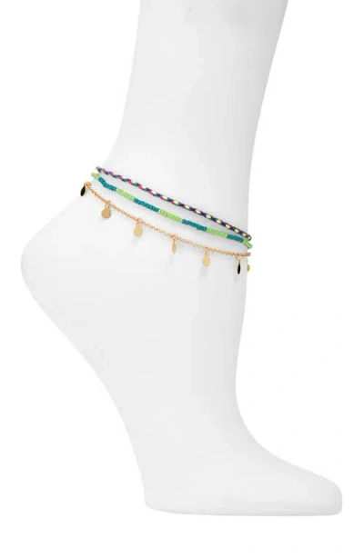 Dangling charms, colorful beads and threads enhance the playful vibe of this anklet set you can mix and match for endless combinations. 9" length Set of three anklets Goldtone plate/textile/glass Imported Not available for sale and shipment to Germany