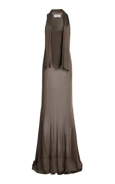 This knitted fabric is becoming core to the collection. The shiny stretch viscose was plied up for opacity; knitted circularly to create a bias-cut long dress; and pleated — proving its versatility across multiple end uses. A micro knit hoodie shifts from casual day to evening easily. In a more transparent gauge; the same viscose reads like liquid over the body.