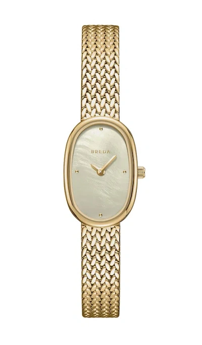 Breda Small Jane Watch in Metallic Gold. Breda Small Jane Watch in Metallic Gold. 18k gold-plated case and band. Imported. Champagne mother of pearl dial. 18mm case and band. 3ATM splash-resistant. Japanese made Miyota quartz movement. BEDA-WL50. 1757a.