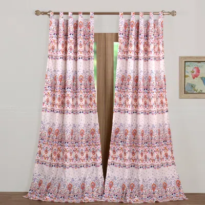Tangerine, fuchsia, blue and gold paint a glimmering garden scene against an alabaster ground. Sure to captivate your imagination, this window treatment brightens your room with unique charm. Dimensions - Each panel measures 42" wide x 84" long including tabs. Each set features two panels and two tie backs. Lined for increased privacy and protection from the sun. Tab tops fit up to 3" rod for hanging. Machine washable 100% Polyester