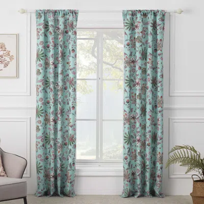 Add a chic boho vibe to your space with the Audrey 4-piece curtain panel set. Stylized jacobean fern and floral prints in turquoise and coral tones create an exotic, tropical look and feel. Each set features two panels and two tie backs. Dimensions - Each panel measures 42 inches wide x 84 inches long. Total window coverage, 84 inches x 84 inches. Lined for increased privacy and protection from the sun. Three-inch rod pocket along the top fit most curtain rods for hanging. 100% polyester microfiber. Machine washable.