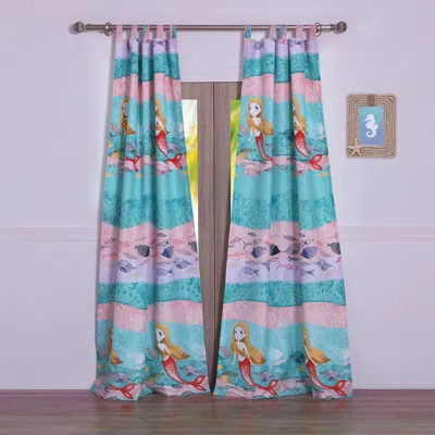 Happy and free, swimming in an undersea fantasy, young mermaids frolic together with friendly fish. Awash in waves of aquamarine, pink and blue, the Mermaid 4-piece window curtain panel set adds bright color and character to any room. Set includes two 42" wide panels and two tie backs. Lined for increased privacy and sun protection. Tab top panels fit up to a 3" diameter rod for hanging. 100% polyester. Panel pair comes with 2 tiebacks. Panel pair measures 84" W x 84" L (combined dimensions of both panels), plus two 3x24" long tie backs. Machine washable.