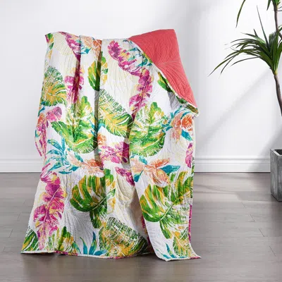 Liven up your space with the Tropics quilted throw blanket. Jungle green, gold, ocean blue, teal, mango, coral and fuchsia create the mood of a bright tropical oasis. The Tropics quilt will spice up your favorite loveseat or sofa - also makes a great wall hanging. Reverses to an all-over flamingo coral. Palm frond quilting pattern completes the look. Throw dimensions - 50x60 inches, +/- 2-inches. Machine Wash. 100% microfiber polyester face and back with cotton rich fill (60% cotton, 40% polyester), prewashed with extra softener for extra softness and comfort.