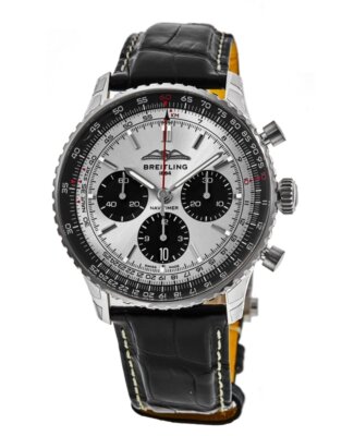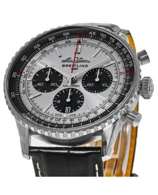 Breitling Navitimer B01 Chronograph 43 Silver Dial Leather Strap Men's Watch AB0138241G1P1 Retail Price: $9,100.00 Sale: $7,260.00 100% Brand New & Authentic Product Shipped Within 3 Days Top Seller Reviews speak for themselves Click to view Shop risk free with WatchMaxx Money Back Guarantee 5 Year Warranty Usually ships within 3 business days of receiving payment. We accept PayPal. For other payment options please contact us. DetailsWarrantyReturn PolicyShipping & TaxAbout UsQuestions? Product Details Case Case Material Stainless Steel Case Shape Round Case Diameter 43mm Case Thickness 13.6mm Case Back Transparent Bezel Bi-directional rotating, slide rule Crystal Scratch Resistant Sapphire Dial Dial Color Silver Dial Description Silver tone hands and Index hour markers with minute markers around the outer rim and 3 sub-dials on a Silver Dial Markers Stick Hand Color Silver Sub-Dials 60 Second, 30 Minute and 12 Hours Calendar Date at 6 o'clock Functions Date, Power Reserve, Hour, Minute, Second and Chron