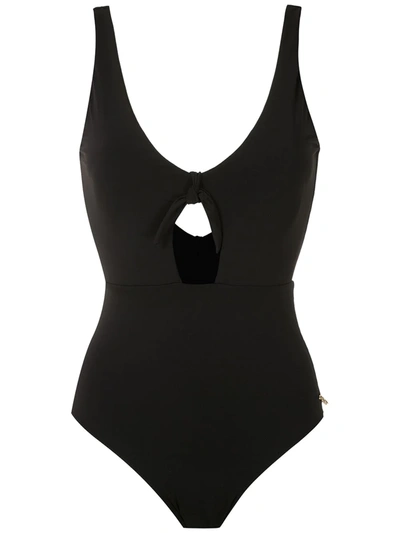 Black cut out swimsuit from Brigitte featuring a U neck, a removable bra support, a bow detail, a cut out detail, an elasticated trim, a lining and a stretch fabric with a fresh touch. This item is true to fit. Swimwear must be tried on over your own garments.
