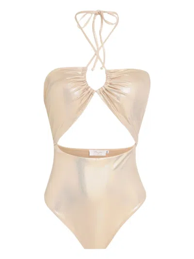 gold-tone metallic finish halterneck tie fastening cut-out detail Be mindful to try on swimwear over your own garments.