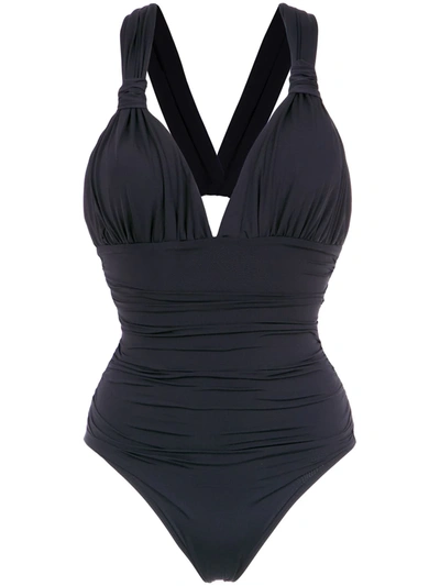 Black 'Eli' draped swimsuit from Brigitte featuring a v-neck, a lining and cut out details. Underwear and lingerie must be tried on over your own garments. This item is true to fit. Please note this item has a Brazilian cut.