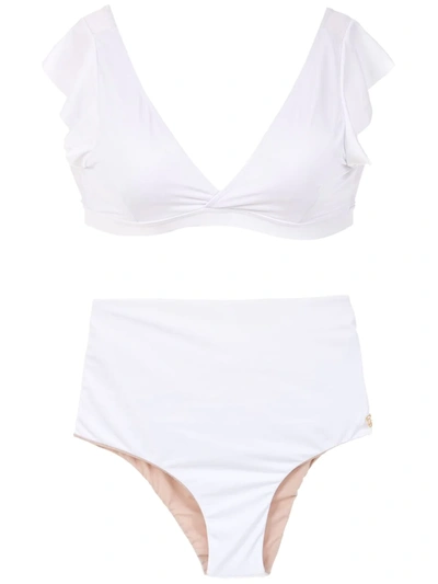 White plain bikini set from Brigitte featuring a v-neck, short sleeves and a high rise.
